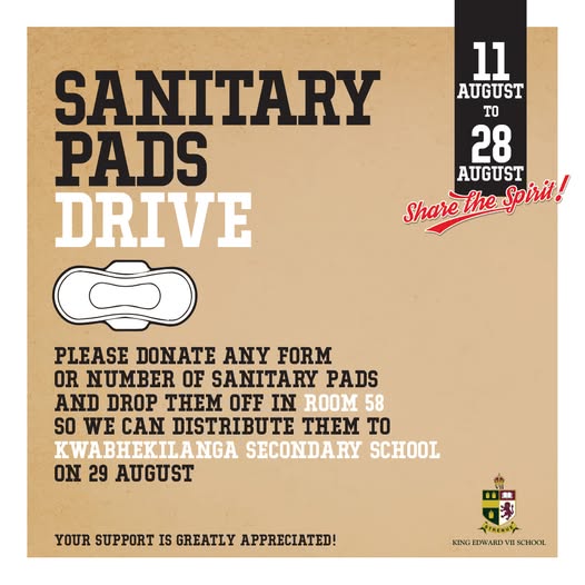 In a powerful act of solidarity, the young men at King Edward VII School are stepping up to support girls in need. We’re proud to host a Sanitary Pad Drive, collecting essential products to help promote dignity for all. They will be distributed to Kwabhekilanga Secondary School on 29th August. If you not at KES please feel free to drop your donations at the security. Let’s Make A Difference!